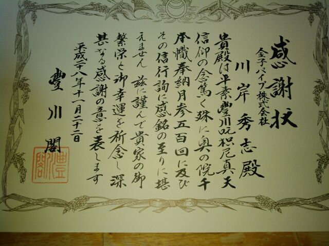 本殿に招かれご祈祷をしていただき(中は、撮影禁止🈲です)その後表彰していただきました。祖父👴の時代からの信心ですので、私ではなく、亡き父、亡き祖父のおかげだと感謝していますm(__)m